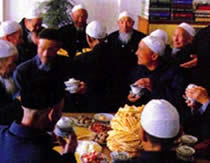 丧葬食俗因地区不同而有所区别。有的地方办丧事三天不动烟火,由附近的亲戚邻居送食,禁止请客,三天后方进行纪念活动。 婚俗 结婚筵席一般都要8—12道菜,忌讳单数,象征新婚夫妇永远成双成对。甘肃地区的新婚夫妇生头胎,男方要携带礼物去女方父母家及至亲家报信,10天内岳母要携红糖、米等营养品和小孩穿的衣物来看“小月子”。男方家要设宴款待来客。