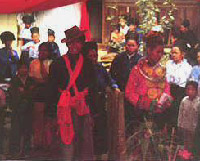 迷确与迷考 迷确,也称“奴帕劳拉”,意为拉婚。迷考意为偷婚。是过去流行于景颇族的一种抢婚习俗。 小伙子爱上了姑娘,请媒人至女家求婚,如女方父母同意,便议室聘礼,约定婚娶日期,到时,通过拉婚形式“拉走”新娘。传说,这样一拉,会惊走新娘身上的鬼魂,可保日后平安无恙。如果女方父母反对,其父母便将女儿藏起来,以防男家来人偷走。小伙子约请媒人和朋友协助,在夜间想办法将姑娘引走,强行拉走,藏于媒人家中。然后,告诉姑娘父母,其父母无奈,只好议定聘礼,择日举行婚礼。