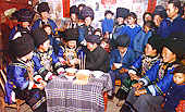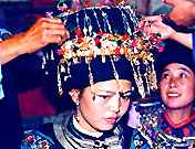 结婚之前一天叫“插花日”此日女方家宾客齐集,男方必须在插花日派迎亲队伍去女方家。迎亲队伍由年青的7----11人单数组成。领队的男人叫“娶亲大哥”,女子叫“娶亲婆”另外还跟随一班吹鼓手[乐队]。迎亲队到女方家寨外即鸣放鞭炮,女方紧闭大门,必待娶亲大哥送 上开门礼红包,讲一番娶亲客套话,才准进门, 迎亲队坐席饮酒时。女方村中的姑娘们会向迎亲客人们劝酒,必将迎亲客人灌醉,姑娘们还借劝酒、上菜、上茶、盛饭等伺机向迎亲人脸上摸抹锅底黑,摸得娶亲人个个成为大花脸,名曰“打粑”, 或用豆渣和荨麻叶对娶亲人围攻,打得娶亲人遍体都是豆渣;荨麻叶蜇得娶亲火焦辣疼,叫“打亲”“打发”,既越打越亲,越打越发。要女方待老年人出来制止才停。然后,晚上男女青年可以对唱山歌,通宵达。结婚日叫做“正日”,正日黎明,开始发亲,由女方送亲大哥[兄弟]背新娘从正门出换新鞋送入户门外的花轿中,抬去男家。若途中与别寨娶亲队伍相遇,则各抢先从高处绕过。到了男家门外就由娶亲大哥背新娘从门前火盆上走过,然后新郎新娘行礼拜堂,男方则大摆宴席三天,答谢亲朋好友等不在话下,过完三早后新郎陪新娘回娘家探亲小住几天。