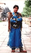 女子衣饰 羌族妇女爱穿自织的麻布长衫、形似旗袍,长及脚背,袍外多套上一件羊皮背心。领口、袖口、腰带上都绣有各种几何花纹图案,衣领镶有小粒银饰,头缠青色、或白色瓦状头帕,用绣花腰带束腰,脚打绑带,穿尖钓鞋,戴特大银耳环和项圈。