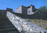 庄房外形 庄房的外形绝大多数为堡垒式(似几何学上的四棱台),基部比较宽大,往上逐渐收缩,最高处为一方形的石板小堆,中插一小树枝,称为房背,在房背四周,常围以矮墙。