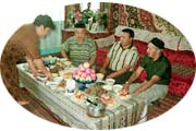 三餐习惯 塔塔尔族人一天三餐,中午是正餐,早晚是茶点。进餐时男女不分席,全家坐在一起,由主妇主持盛饭。塔塔尔族人吃饭时既不用手抓,也不使筷子,而是用勺子,这是固有的习惯。塔塔尔族人去参加维吾尔族或哈萨克族的宴请时往往随身带着一把勺子。他们用餐时,每个人面前放一块小手巾,用来随时擦拭餐具。到塔塔尔族人家做客时,不要剩茶剩饭,应全部吃尽。吃完应向女主人致谢。